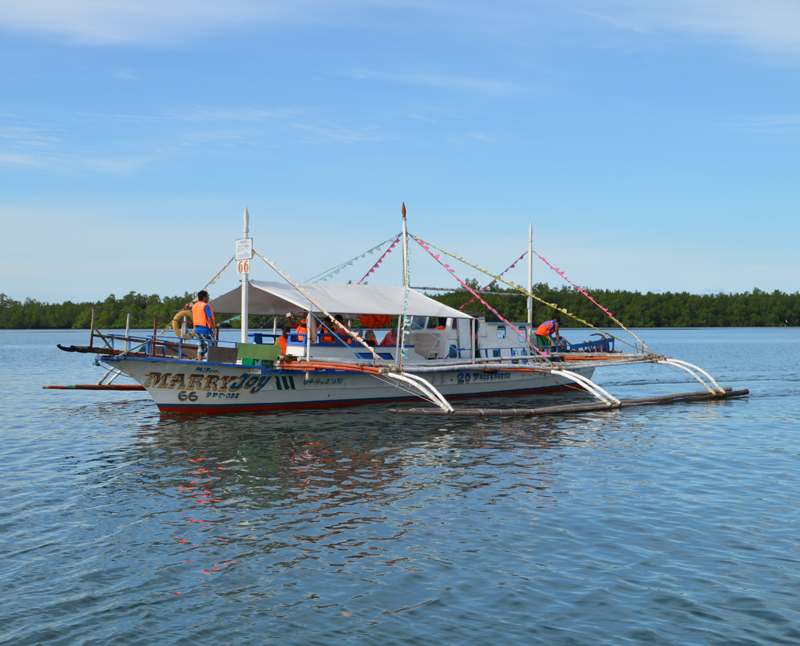 Von der Anlegestelle ging es dann mit einem Boot weiter. Diese Art von Schiff trägt hier in den Philippinen die Bezeichnung "Bangka". Es ist so aufgebaut wie ein normales schmales Boot mit jedoch wenig Tiefgang und auf beiden Seiten jeweils einen Ausleger welcher ebenfalls im Wasser liegt. Durch das, dass das Boot wenig Tiefgang hat, ist es mit Verhältnismässig wenig Energieaufwand möglich eine anständige Geschwindigkeit zu erreichen. Die seitlichen Ausleger verhindern dass das Boot kentern kann.